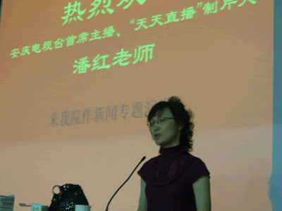 5月11日晚,应教育学院邀请,安庆电视台首席主播、资深记者、《天天直播》制片人潘红老师在菱湖校区315教室作题为“做个合格的新闻工作者”的学术报告。教育学院党总支书记黄警钟副教授、张启树副教授和广播电视新闻学专业150名学生聆听了报告。