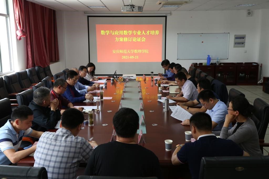 为更好地构建师范专业人才培养质量体系,促进数学与应用数学国家一流本科专业建设,提高人才培养质量,数理学院于5月21日在数理楼307会议室召开了数学与应用数学(师范)专业人才培养方案修订论证会。安庆市教研室主任孙彦、安庆市教研室综合室主任何承全、安庆一中特级教师陈清贤,安庆二中特级教师余永安,安庆市石化一中教科室主任查显耀应邀担任论证专家。数理学院党委书记钟金标教授、副院长张海教授、数学与应用数学专业负责人、各教研室主任和骨干教师参加了论证会。会议由副院长张海教授主持。