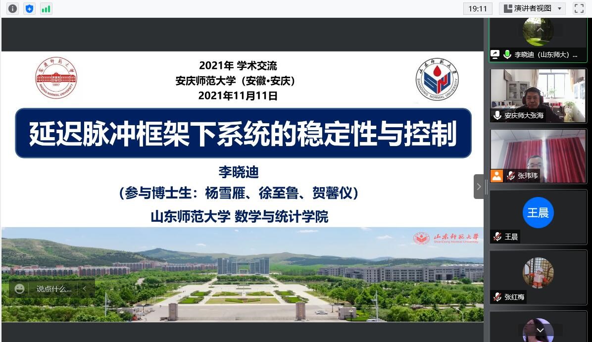 11月11日下午,山东师范大学数学与统计学院院长李晓迪教授应数理学院邀请作了一场题为“延迟脉冲框架下系统的稳定性与控制”的线上学术报告。数理学院部分教师、数学一级学科硕士点和统计学一级学科硕士点研究生参加了本次报告会,报告会由数理学院副院长张海教授主持。