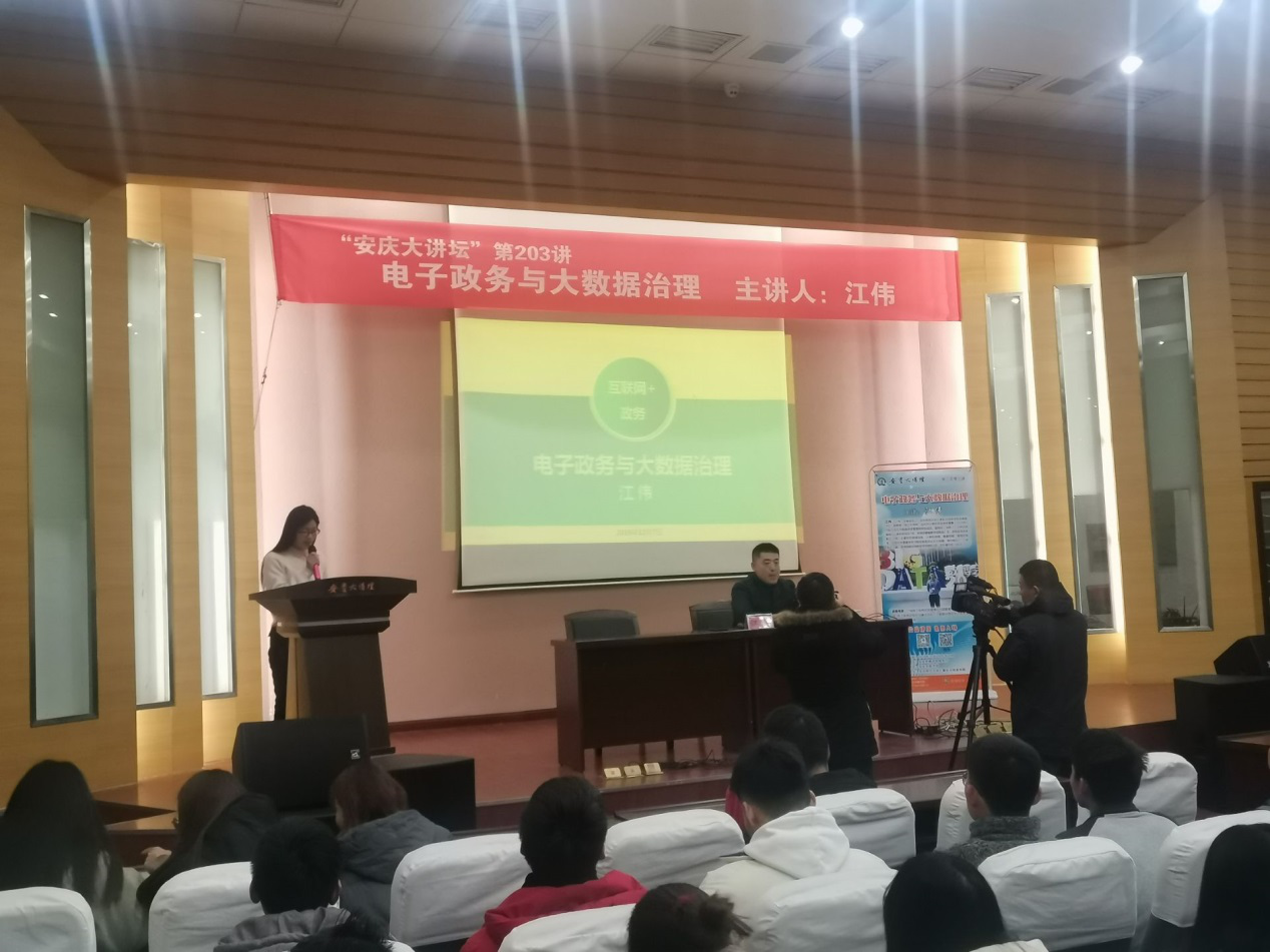 安庆市计算机学会常务理事,计算机学院副教授、硕士生导师江伟老师应邀主讲《电子政务与大数据治理》,报告讲授了我国电子政务的发展情况与国家政策,安庆市互联网+电子政务的现状与建设目标,以及大数据治理在电子政务建设发展中的重要作用。beat365官网大学生和安庆市民近80人聆听了讲座。