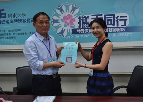 beat365官网教育学院院长曹长德主持了主题为“特殊教育支持系统”的论坛,在会上曹长德针对大陆和台湾在特殊教育支持系统存在的差异方面发表了观点,他表示:台湾特殊教育的师资比远远超过大陆,作为高校应该重点培养特殊教育人才,弥补当前特教人员严重不足的现象,并且注重教师素养的提升。特殊教育学校应向综合化发展方向,承担指导中心、资源提供输出、义务教育、康复训练和职业教育等功能,而作为特殊教育指导中心必须实行行政管理权、专业指导权、督导评估权“三权合一”。台湾屏东大学为表达曹长德院长对本次论坛的贡献,特发感谢状以示感谢。