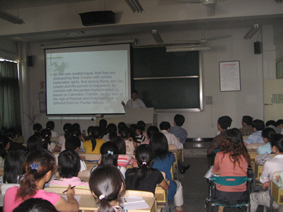 洪教授的讲授图文并茂,深入浅出,让听众对美国文学中上帝形象变迁的知识有了进一步了解;而他精彩的演讲内容和幽默风趣的语言,更是博得了听众的不时的热烈掌声。讲座受到了与会师生的一致好评。
