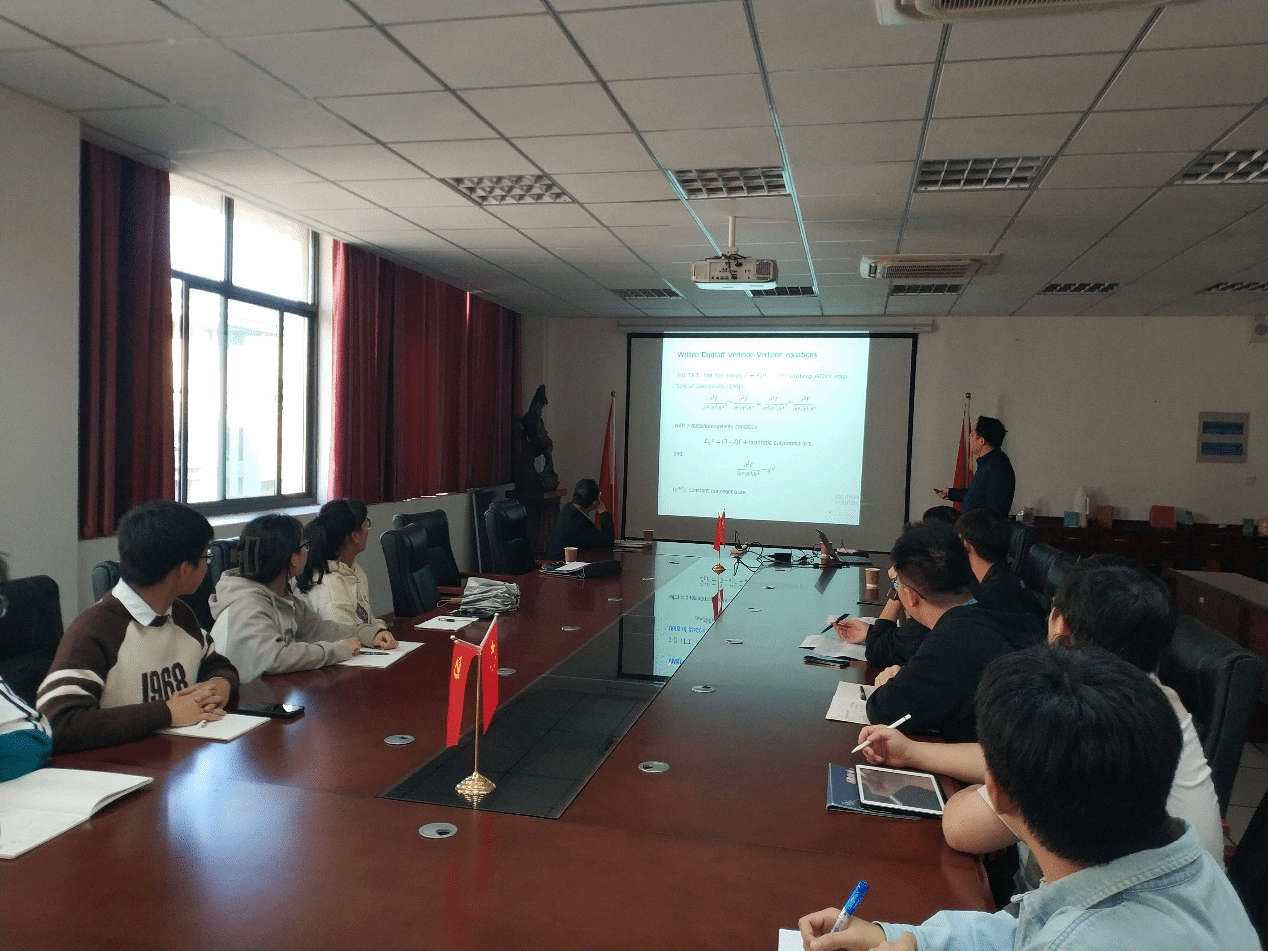 报告中,左教授首先回顾了2维拓扑场论中WDVV方程和Frobenius流形的关系,接着介绍它们和各类可积系统的密切联系,并着重介绍Coxeter群和对称群在研究工作中的应用。他不仅详细阐述了研究问题的历史背景,还介绍了自己与合作者近期在这些问题上的研究进展。左教授的报告内容翔实,不仅阐述了深奥的专业理论知识,还介绍了科研前辈和自己做研究工作的经验总结。