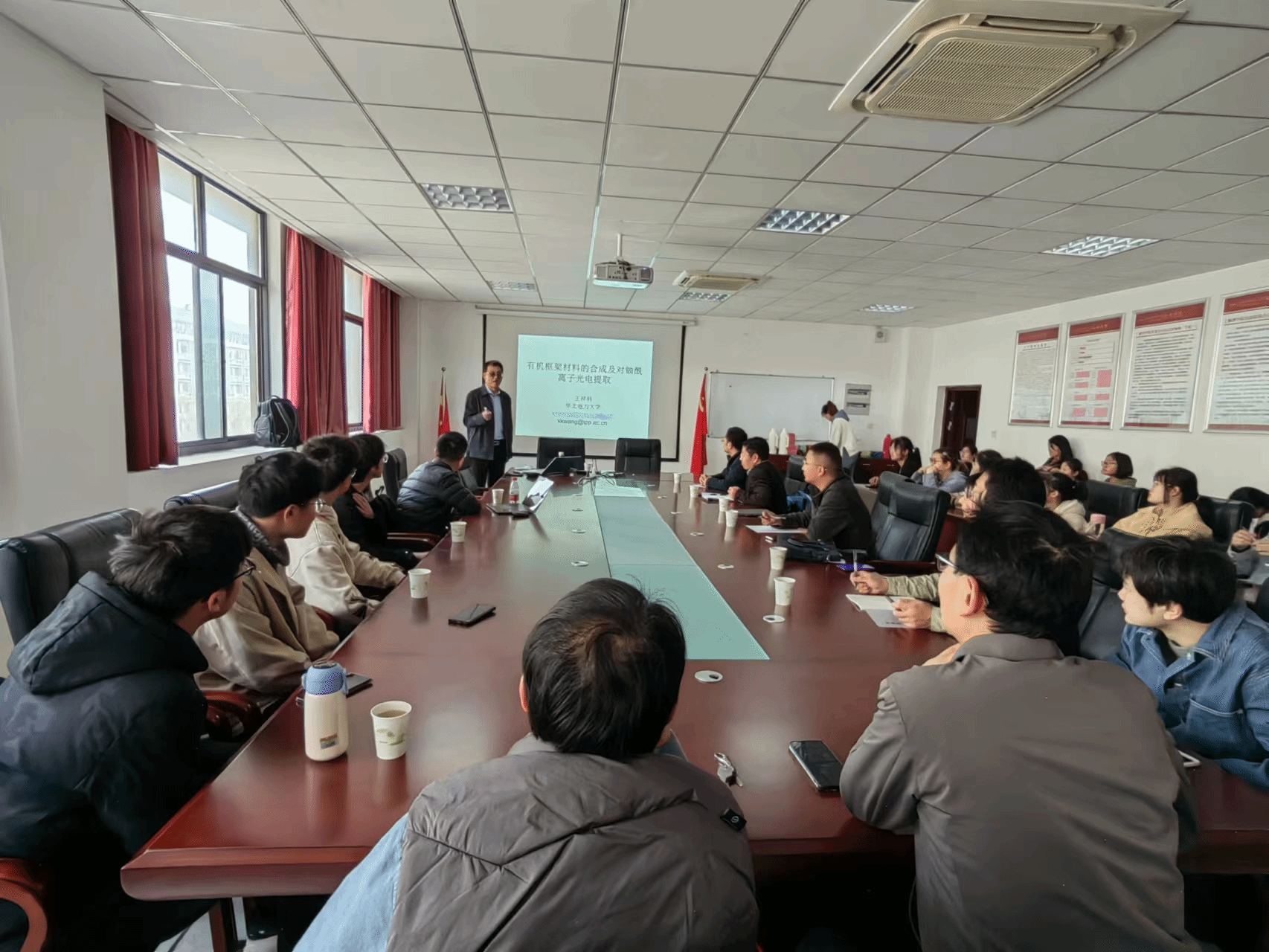3月10日,数理学院在307会议室举行学术交流和国家自然科学基金申请书撰写研讨会。本次会议邀请华北电力大学博士生导师王祥科教授和中科院合肥研究院智能所徐欢博士后参加。王祥科教授作了题为“有机框架材料的合成及对铀酰离子光电提取”的学术报告。研讨会由数理学院副院长伍代勇教授主持。数理学院、化学化工学院和资源环境学院部分师生参加本次活动。