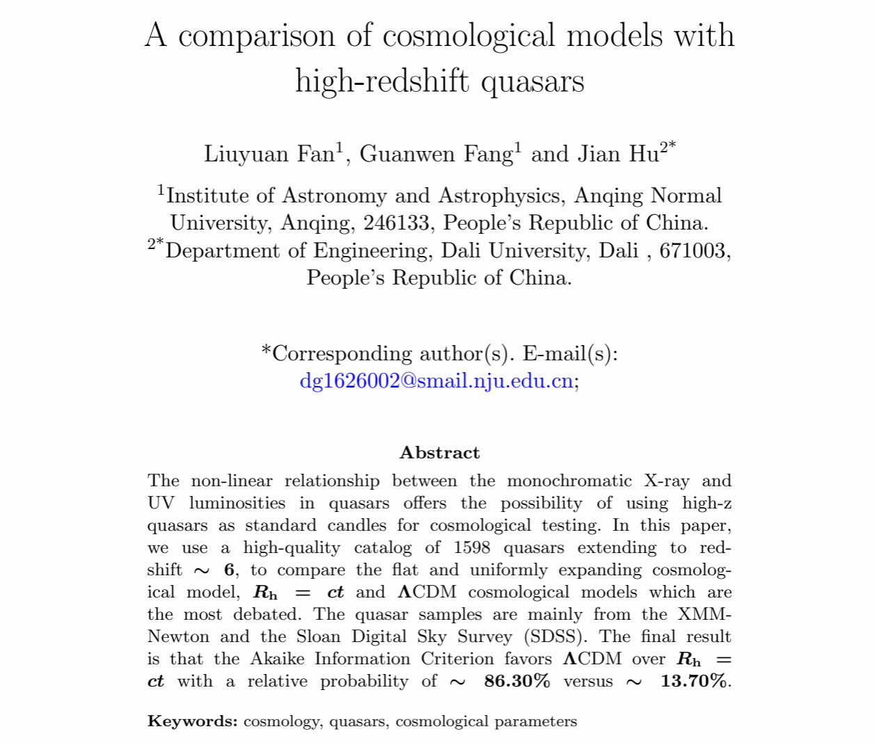 近日,数理学院数学与应用数学专业2019级稼先班范刘源同学为第一作者的论文《A comparison of cosmological models with high-redshift quasars》被期刊《Astrophysics and Space Science》(中科院JCR分区三区,IF=1.90)接受发表。本论文是在数理学院天文与天体物理研究所方官文研究员及其研究团队的指导下完成,beat365平台唯一官网为第一完成单位,这是数理学院首次以本科生为第一作者发表的SCI论文。