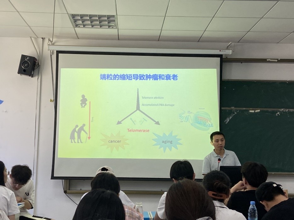 程龙副研究员首先对端粒及其意义进行了讲解,随后介绍了端粒酶装配机制以及SARS-CoV-2的衰老易感机制,并对SARS-CoV-2的易感基因筛选进行了讲述。程老师的报告图文并茂,深入浅出,从宏观到微观为我们介绍了端粒如何导致衰老,为学生扩展了专业知识,增强了学生的理论知识。