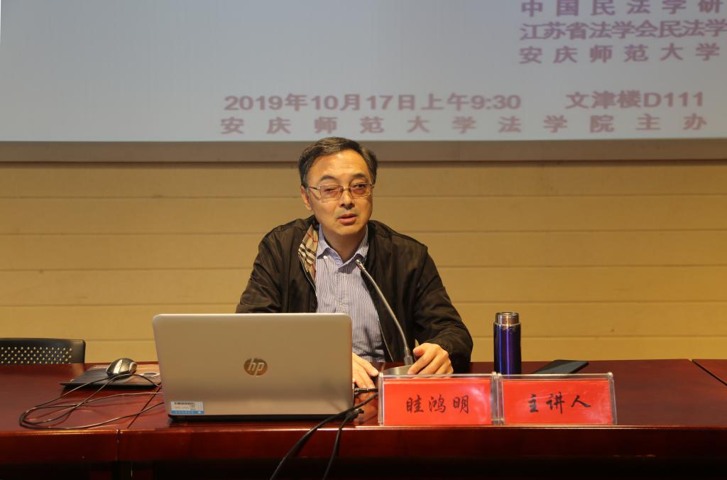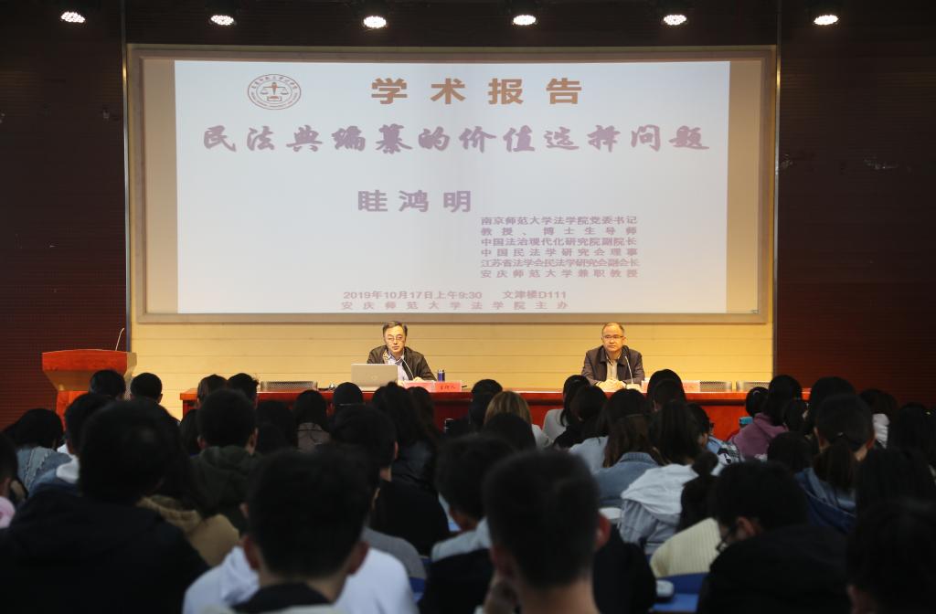 10月17日上午在龙山校区文津楼D111报告厅,南京师范大学法学院党委书记、博士生导师眭鸿明教授来beat365官网作“民法典编纂的价值选择问题”学术报告。报告会由法学院院长焦少林教授主持,法学院2019级法律硕士研究生及法学专业2018级、2017级共170余人聆听了报告。