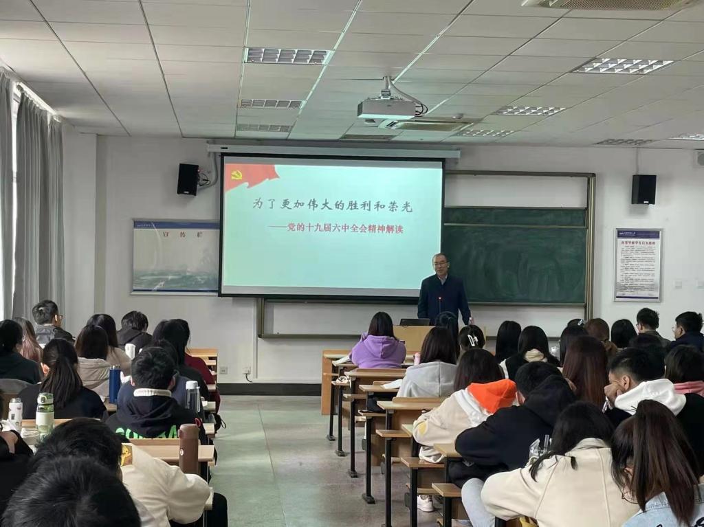 11月17日,马克思主义学院金文斌教授在E楼106教室作了《为了更加伟大的胜利和荣光——党的十九届六中全会精神解读》的报告, 100多名2021级研究生现场聆听了报告,学习了党的十九届六中全会精神。