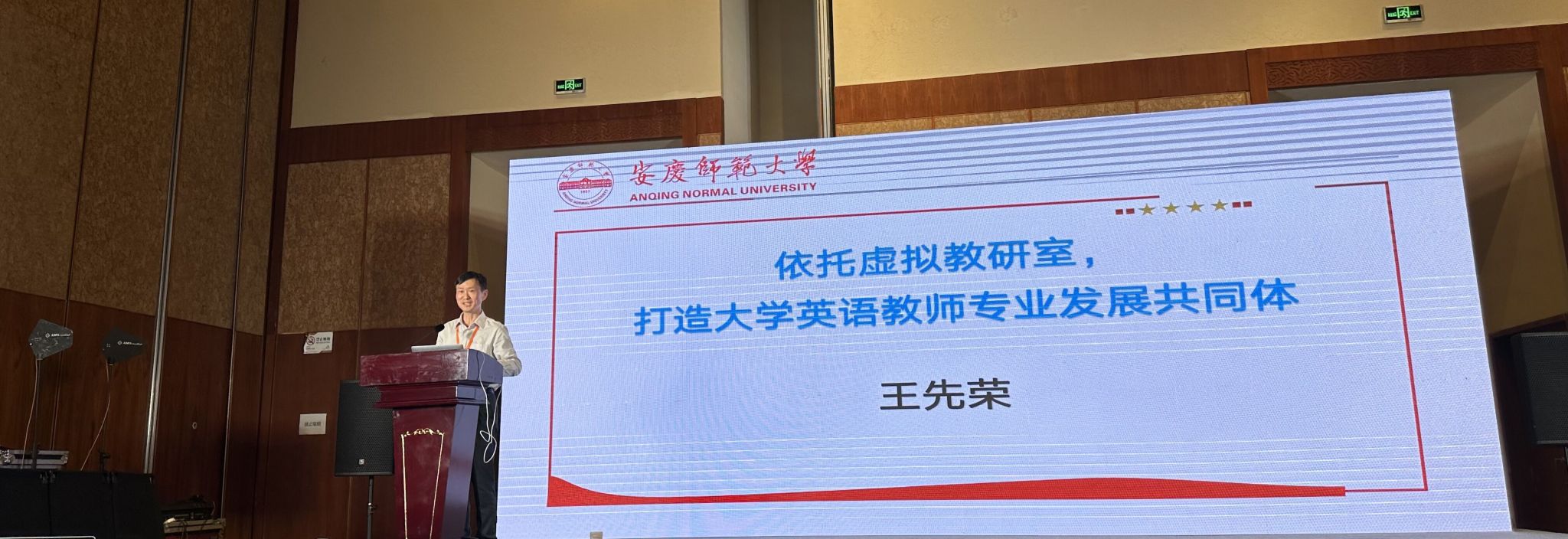本届论坛主题为“新思想·高质量·共同体”,王先荣在“教师为本,推进共同体建设”平行论坛上做了题为“依托虚拟教研室,打造大学英语教师专业发展共同体”的专题报告。他介绍了虚拟教研室建设的背景、内涵、内容和原则,并着重从“创新组织模式,筑牢群体认同基础;依托智慧平台,打造教学资源共建共享共同体;开展校际课程共建,建设教学协同共同体;打造品牌教研活动,建设教研创新共同体”四个方面与参会代表们分享了大学英语虚拟教研室"安徽实践"经验,阐明了虚拟教研室建设在以教师发展为引领的教育教学改革新时代所发挥的积极作用。(撰稿、摄影:瞿宁霞 编辑:徐辉 审核:王先荣 王惠)
