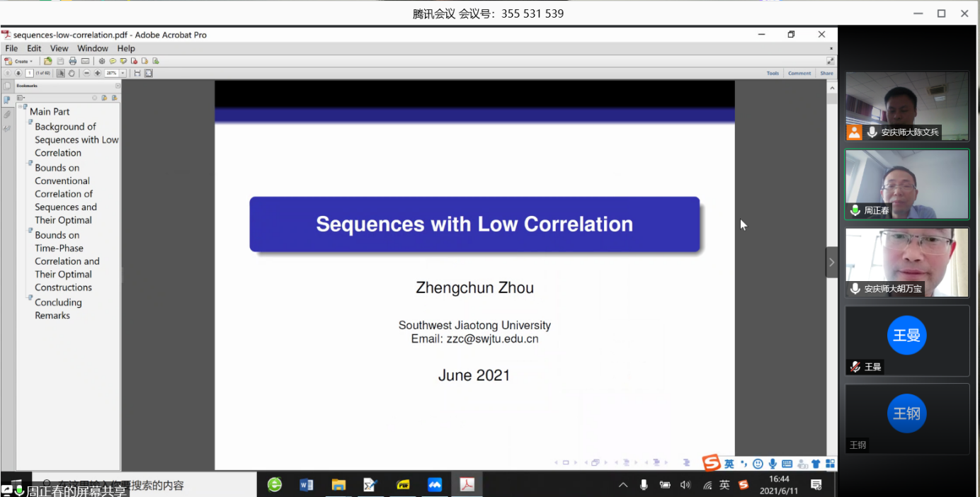 报告会上,周正春教授首先介绍了西南交通大学“代数编码与密码理论”团队的情况、主要研究方向以及研究成果。他表示团队的科研导向以各种通信场景中的相关的工程问题为背景,通过建模转化为数学问题,研究这类数学问题所得的结果用来指导工程实践,达到解决工程领域的技术问题的目标。周正春讲解了具有最优相关性序列的有关概念,包括序列相关性的Welch界、Sarwate界、Sidelnikov界及具有最有相关性序列的研究进展。他对自己团队近期在全局最优和局部最优的序列设计领域的研究成果以及待解决的有关公开问题进行了介绍。最后周正春教授与部分教师和研究生同学就通信领域中的序列设计、代数编码与密码的一些热点问题进行了线上互动交流。