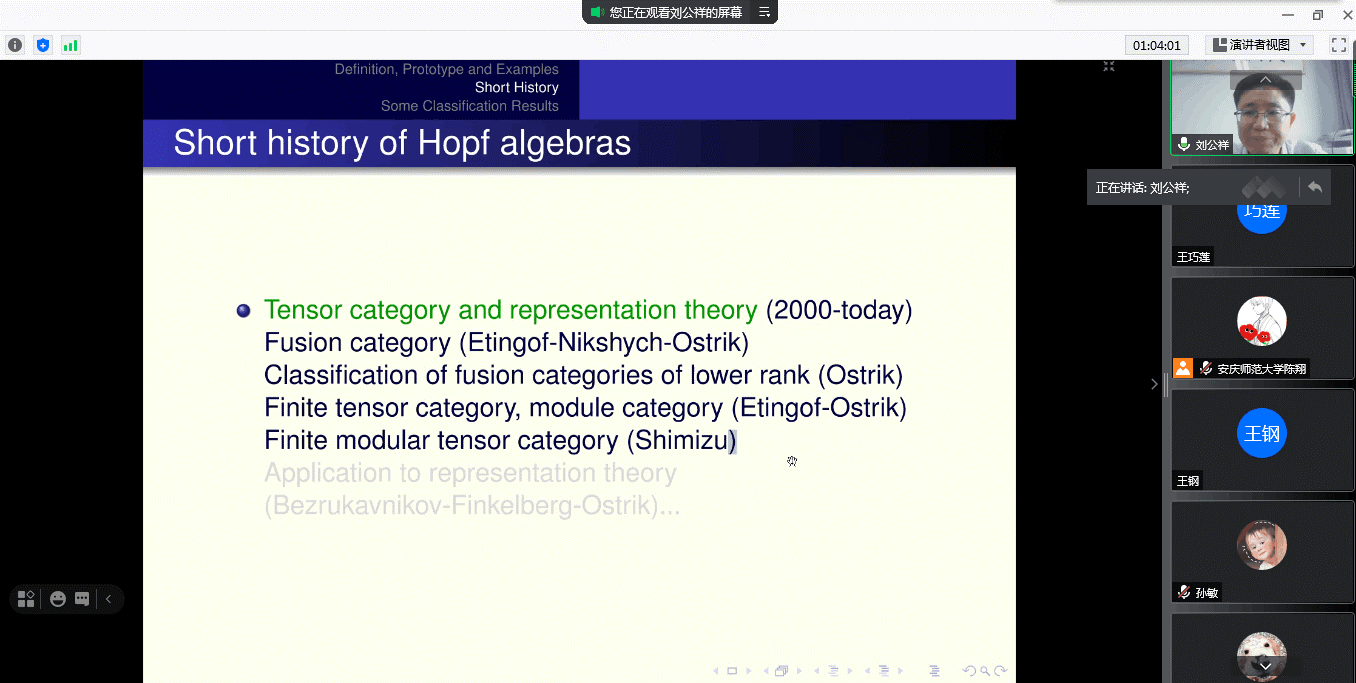 报告会上,刘公祥教授从代数和余代数出发,给出了Hopf代数定义的来源与相关背景,阐述了Hopf代数的发展历史和一些Hopf代数的具体例子,最后详细讲解了Hopf代数一些重要的分类结果。同时,刘教授还分享了自己多年来从事科学研究的深刻体会和宝贵经验,为师生们充分展示了Hopf代数领域的前沿进展,极大地提高了与会师生对本方向的研究兴趣。最后刘公祥教授与部分教师和研究生同学就Hopf代数中的一些热点问题进行了线上互动交流。