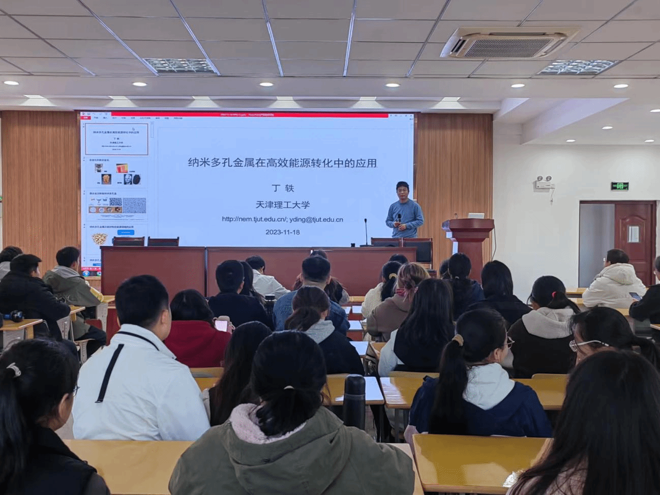 11月18日,天津理工大学丁轶教授应邀为数理学院师生作了题为“纳米多孔金属在高效能源转化中的应用”的学术报告。报告由数理学院副院长易明芳教授主持,数理学院和化学化工学院部分师生参加了此次报告会。