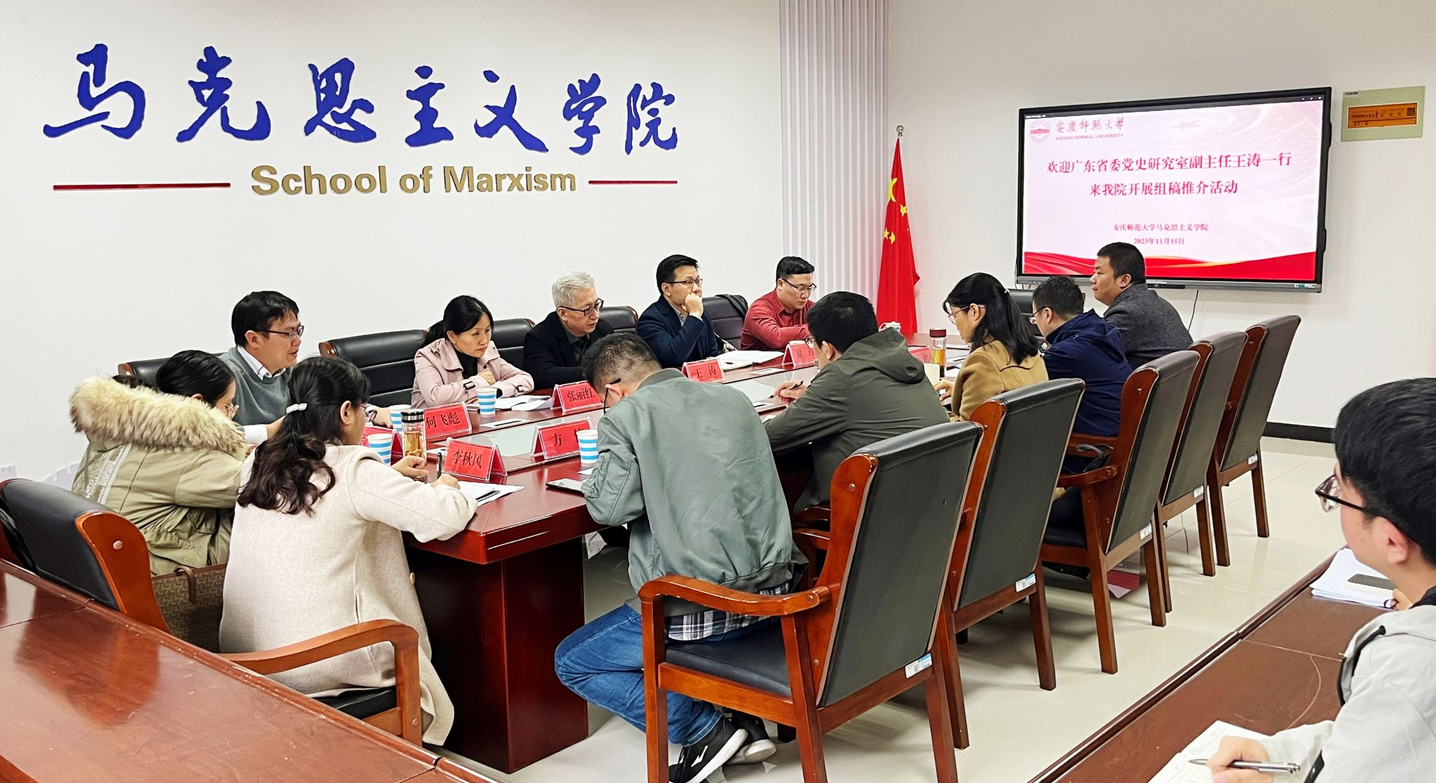 11月15日,中共广东省委党史研究室副主任、《广东党史与文献研究》总编辑王涛一行5人来马克思主义学院开展组稿推介活动。会议由马克思主义学院院长严仍昱主持,副院长张俊生和学院部分教师代表参加座谈会。