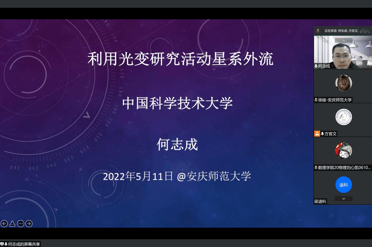 5月11日晚,中国科学技术大学副研究员何志成博士应数理学院及beat365官网大学生天文爱好者协会邀请作了一场题为“利用光变研究活动星系外流”的线上学术报告。数理学院物理系师生和beat365官网大学生天文爱好者协会成员参加了本次报告会,报告会由方官文研究员主持。