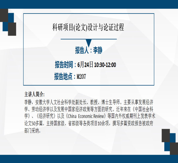 6月24日上午,应经济与管理学院邀请,安徽大学李静教授、博士生导师为该院师生作题为“科研论文(项目)设计及其论证过程”的学术报告,报告会由经济与管理学院副院长黄先军教授主持,该院部分教师与研究生参加了会议。
