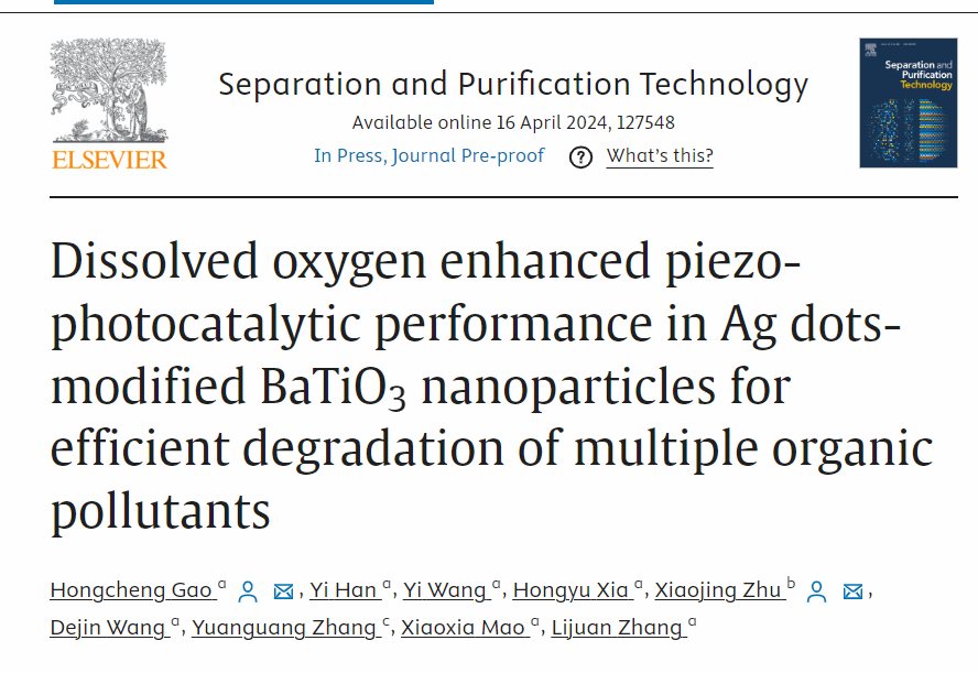 近日,beat365官网资源环境学院高洪成博士以第一/通讯作者在环境领域权威期刊《Separation and Purification Technology》(中科院一区TOP期刊,影响因子8.6)发表题为“Dissolved oxygen enhanced piezo-photocatalytic performance in Ag dots-modified BaTiO3 nanoparticles for efficient degradation of multiple organic pollutants”的论文,beat365平台唯一官网为论文第一完成单位和通讯单位。