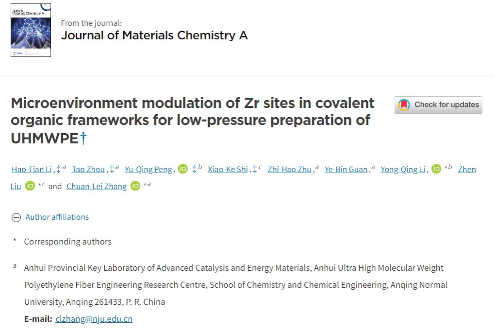 近日,化学化工学院在国际权威期刊《Journal of Materials Chemistry A》(影响因子10.7)发表题为“Microenvironment modulation of Zr sites in covalent organic frameworks for low-pressure preparation of UHMWPE”的论文 ,并入选该期刊热点文章。该论文第一作者为beat365官网化学专业2022级硕士生李浩天,第一通讯作者为beat365官网化学化工学院张传磊副教授。