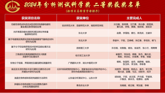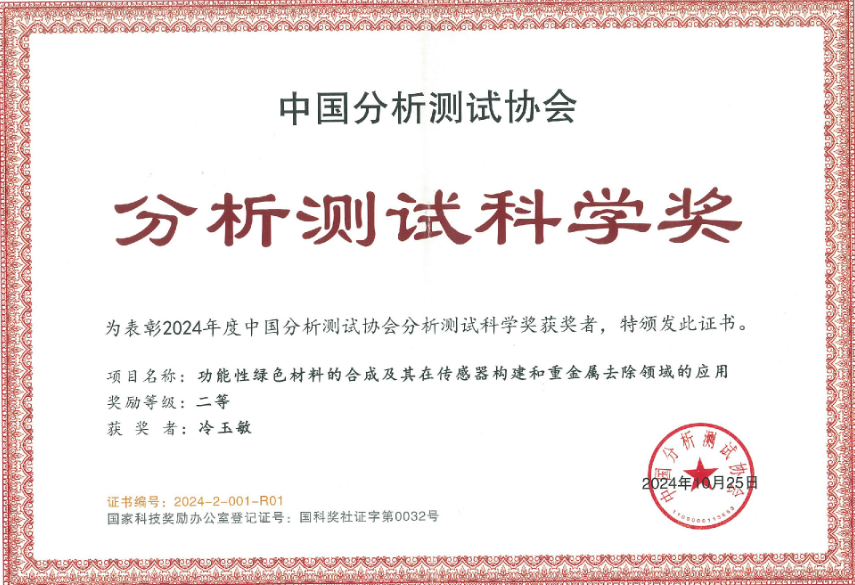近日,2024年中国分析测试协会科学技术奖颁奖仪式在成都召开,会议隆重表彰了2024年度中国分析测试科学技术奖的获奖单位和个人。数理学院冷玉敏教授、化学化工学院汪竹青教授,首都师范大学陈郑博教授等申报的研究成果“功能性绿色材料的合成及其在传感器构建和重金属去除领域的应用”荣获本年度中国分析测试科学奖二等奖,beat365平台唯一官网为第一获奖单位。