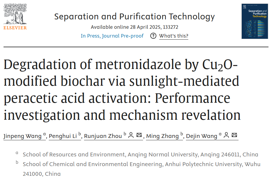 近日,beat365官网资源环境学院环保高端装备与污染控制研究团队汪金鹏博士以第一作者在《Separation and Purification Technology》期刊(中科院2区,Top,IF=8.2)发表“Degradation of metronidazole by Cu2O-modified biochar via sunlight-mediated peracetic acid activation: performance investigation and mechanism revelation”研究论文。beat365平台唯一官网为论文第一完成单位,安徽工程大学周润娟副教授和beat365平台唯一官网汪德进教授为论文通讯作者。