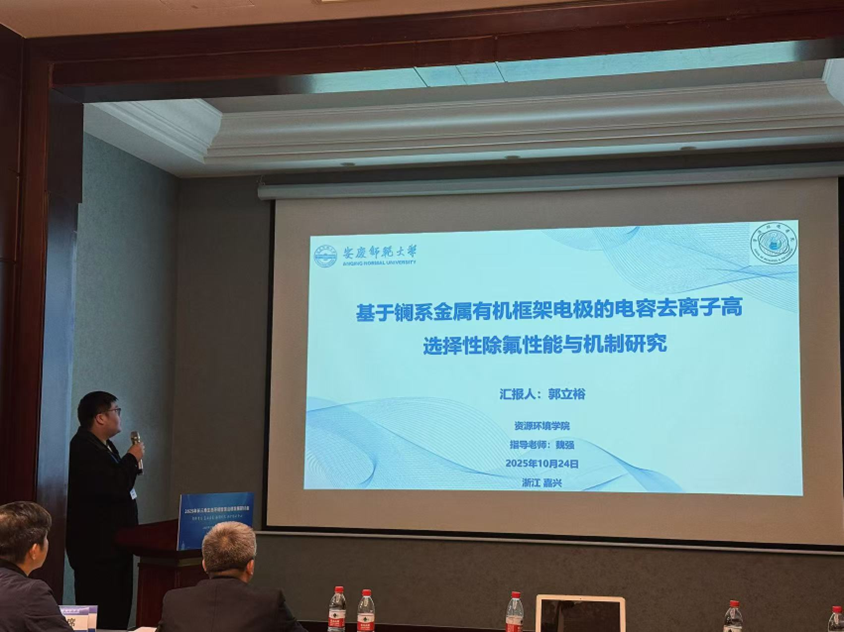 课题组研究生郭立裕作了题为“基于镧系金属有机框架电极的电容去离子高选择性除氟性能与机制研究”的汇报。本研究采用镧系金属有机框架衍生纳米多孔碳(LaBDC/C-NH₂)作为电极材料,研究其电容去离子除氟性能,首次将镧系MOF材料应用于CDI除氟领域,实现了高选择性、低能耗的除氟效果,为解决地下水氟污染问题提供了有效技术方案,具有重要的理论价值和实际应用前景。