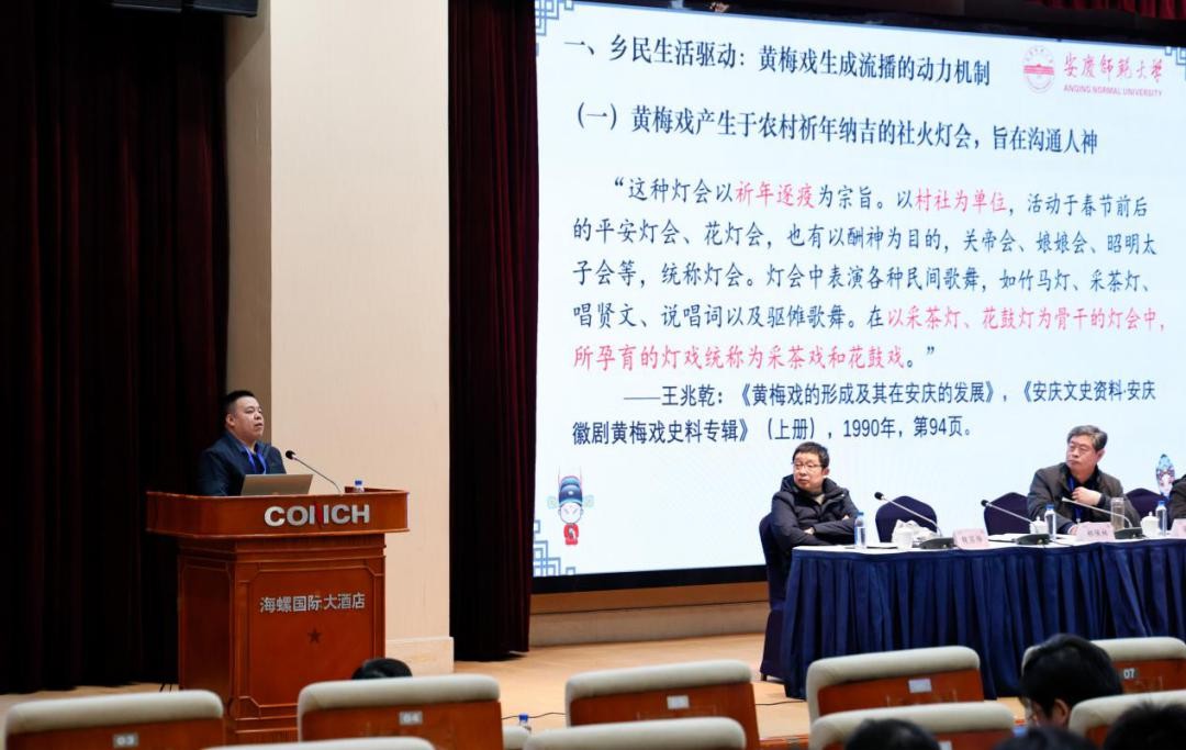 在“文化标识与区域发展”学术研讨会环节,多位专家学者围绕安徽“五大文化”主题展开深入研讨。郝佩林老师受邀以《民间演剧史述中的“地方”视角——以黄梅戏为例》为题作大会主题报告。报告中,他立足黄梅戏发展流变史,打破传统戏剧史侧重艺术形式与名家名段的研究框架,以“地方” 为切入点,梳理了黄梅戏如何从民间小调逐步发展为成熟剧种,并深入探讨了它与安徽地域社会、民俗传统及民众审美之间的紧密联系。报告认为,黄梅戏深深植根于安徽文化基因之中,成为一个鲜明的地域文化标识;其发展历程可作为观察安徽乃至更广泛区域社会发展的一个窗口。与会专家学者对报告观点予以充分肯定并展开了热烈讨论。