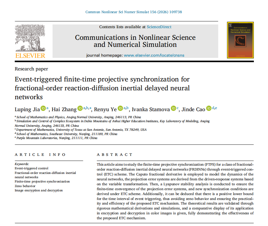 近日,数理学院2024级数学研究生贾露平以第一作者和导师团队在国际学术期刊《Communications in Nonlinear Science and Numerical Simulation》发表论文“Event-triggered finite-time projective synchronization for fractional-order reaction-diffusion inertial delayed neural networks”,导师张海教授为该论文通讯作者,该期刊影响因子3.8,中科院一区期刊。