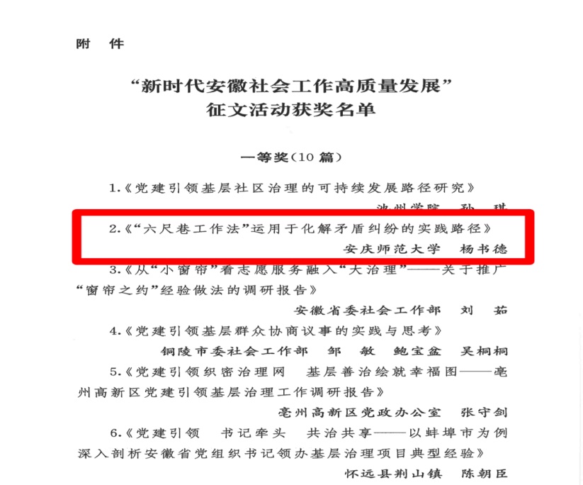 在接到征文活动通知后,法学院积极组织社会工作硕士研究生围绕当前安徽社会工作领域重点问题开展深入调研,撰写提交研究报告,最终喜获3项奖励。其中,2024级研究生杨书德撰写的《“六尺巷工作法”运用于化解矛盾纠纷的实践路径》荣获一等奖,2024级研究生何淑婧撰写的《从“治理对象”到“治理伙伴”:新就业群体参与社区治理的赋能机制》、2024级研究生李晶等同学合作撰写的《有序提升安徽省农村高额彩礼治理实效性的路径研究》均荣获二等奖,充分展现了法学院社会工作硕士研究生扎实的学术功底和积极的科学探索精神。