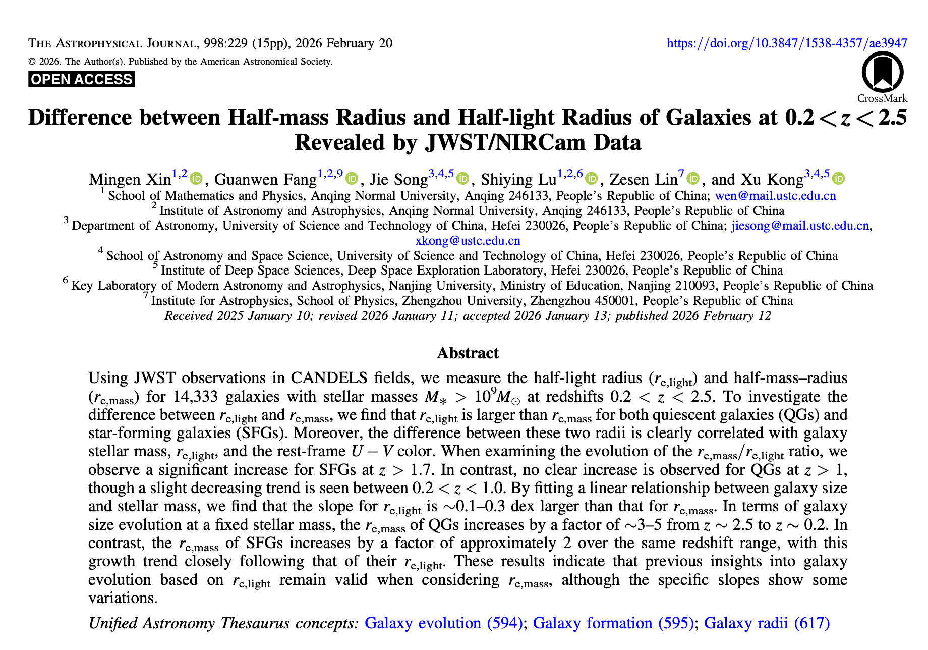 近日,物理学专业2023级邓稼先班本科生辛明恩同学以第一作者撰写的论文《Difference between half-mass radius and half-light radius of galaxies at 0.2<z<2.5 revealed by JWST/NIRCam data 》被SCI期刊《Astrophysical Jounral》正式发表。该期刊为天文学领域国际三大顶级期刊之一,其影响因子为IF=5.4,JCR一区,中科院二区。本论文是在物理与天文空间学院天文与天体物理研究所方官文研究员及陆诗莹博士的指导下完成,beat365平台唯一官网为第一完成单位,方官文研究员为通讯作者。