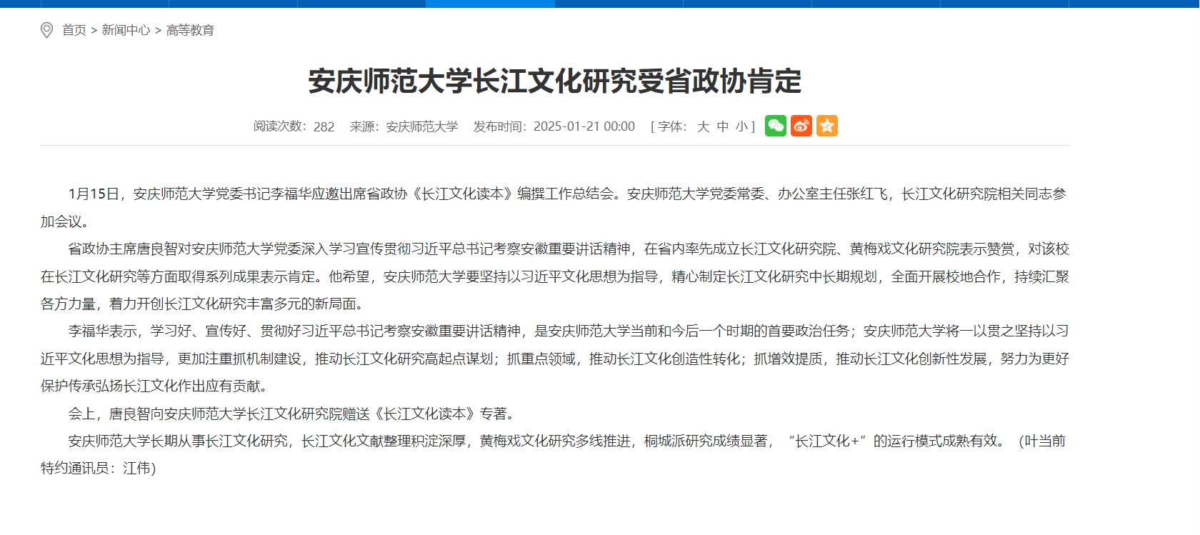 来源:【安徽教育网】beat365平台唯一官网长江文化研究受省政协肯定_安徽省教育厅 (ah.gov.cn)