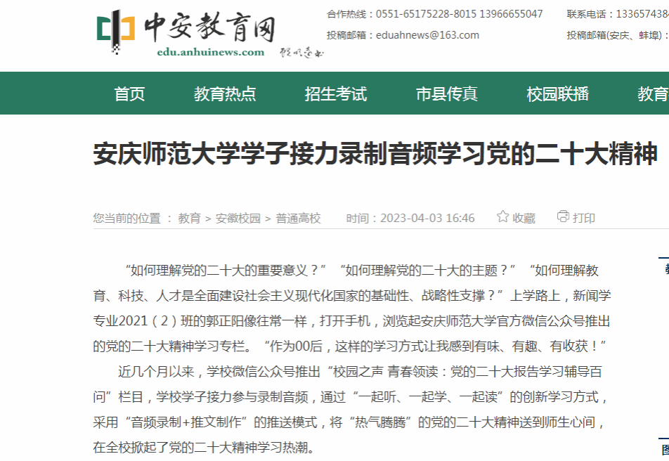 近几个月以来,学校微信公众号推出“校园之声 青春领读:党的二十大报告学习辅导百问”栏目,学校学子接力参与录制音频,通过“一起听、一起学、一起读”的创新学习方式,采用“音频录制+推文制作”的推送模式,将“热气腾腾”的党的二十大精神送到师生心间,在全校掀起了党的二十大精神学习热潮。