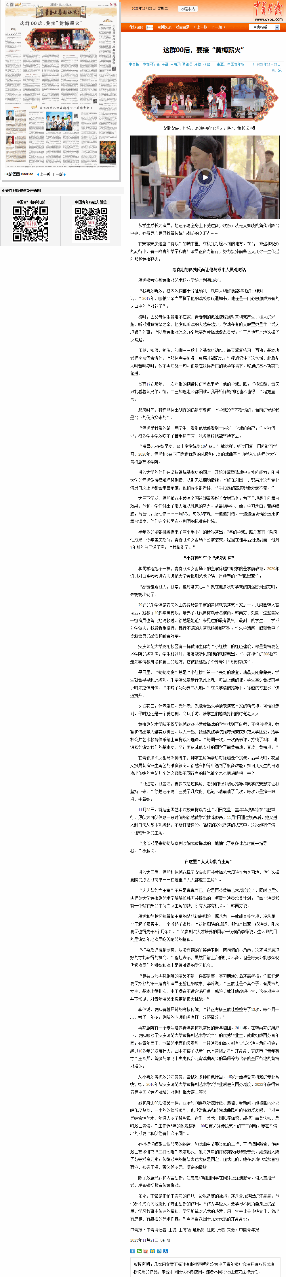 她和身边00后演员一样,业余时间喜欢听流行歌、追剧、看新闻。她被国内外说唱作品热烈、自由的韵律所吸引,也欣赏说唱和传统戏曲风格的强烈反差感。“戏曲是综合性艺术,年轻人多了解影视、音乐、美术、国风等知识,能提升审美认知,反哺戏曲表演。”工作近5年的她观察到,00后更关注传统艺术的守正创新,更在乎演出的戏剧“和以往有什么不同”。