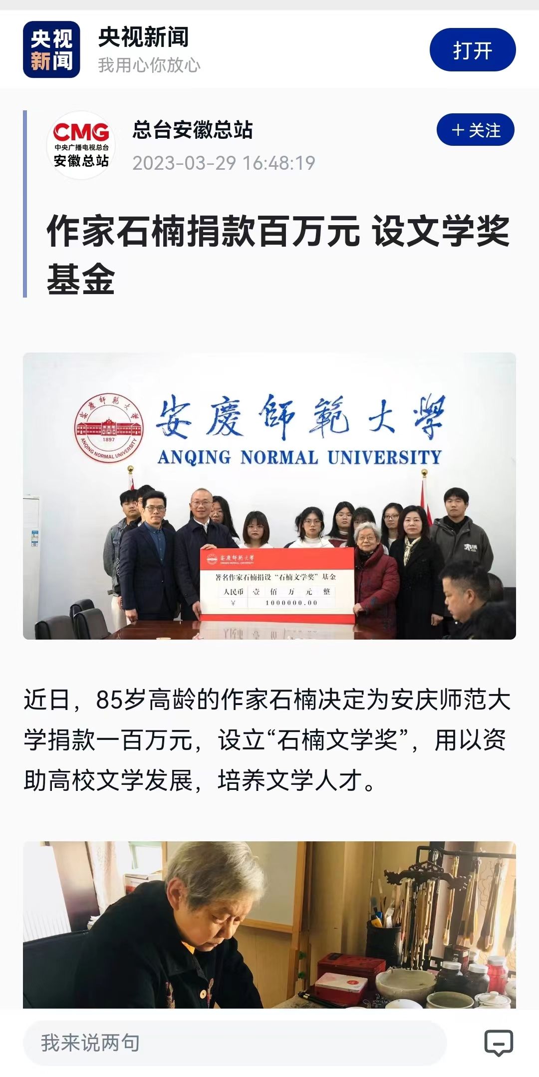 近日,85岁高龄的作家石楠决定为beat365平台唯一官网捐款一百万元,设立“石楠文学奖”,用以资助高校文学发展,培养文学人才。