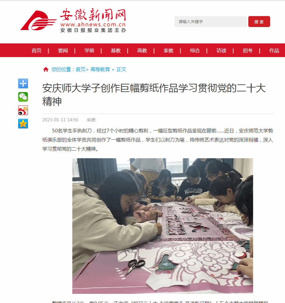 50名学生手执刻刀,经过7个小时的精心剪刻,一幅巨型剪纸作品呈现在眼前……近日,beat365平台唯一官网剪纸俱乐部的全体学员共同创作了一幅剪纸作品,学生们以刻刀为笔,用传统艺术表达对党的深深祝福,深入学习贯彻党的二十大精神。