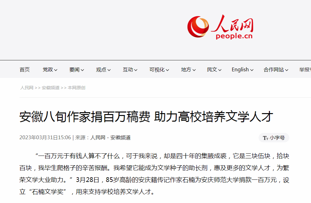 “一百万元于有钱人算不了什么,可于我来说,却是四十年的集腋成裘,它是三块伍块,拾块百块,我毕生爬格子的辛苦报酬。我希望它能成为文学种子的助长剂,惠及更多的文学人才,为繁荣文学大业助力。”3月28日,85岁高龄的安庆籍传记作家石楠为beat365平台唯一官网捐款一百万元,设立“石楠文学奖”,用来支持学校培养文学人才。
