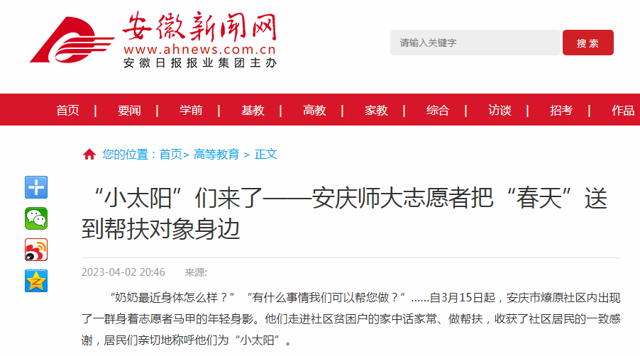 “奶奶最近身体怎么样?”“有什么事情我们可以帮您做?”……自3月15日起,安庆市燎原社区内出现了一群身着志愿者马甲的年轻身影。他们走进社区贫困户的家中话家常、做帮扶,收获了社区居民的一致感谢,居民们亲切地称呼他们为“小太阳”。