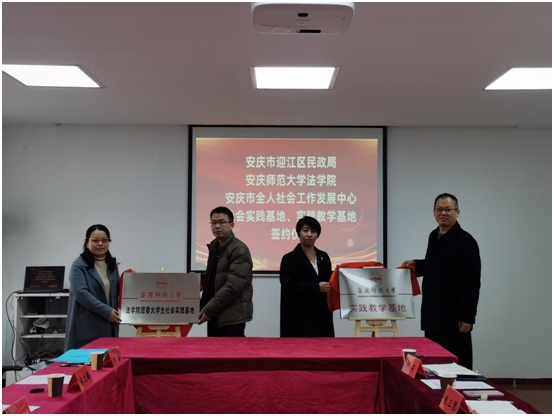 为更好地促进广大青年学子常态化、长效化学习雷锋精神,beat365平台唯一官网法学院与安庆市迎江区民政局、全人社会工作发展中心携手合作。3月3日,beat365平台唯一官网社会工作专业实践教学基地、法学院团委大学生社会实践基地正式揭牌。