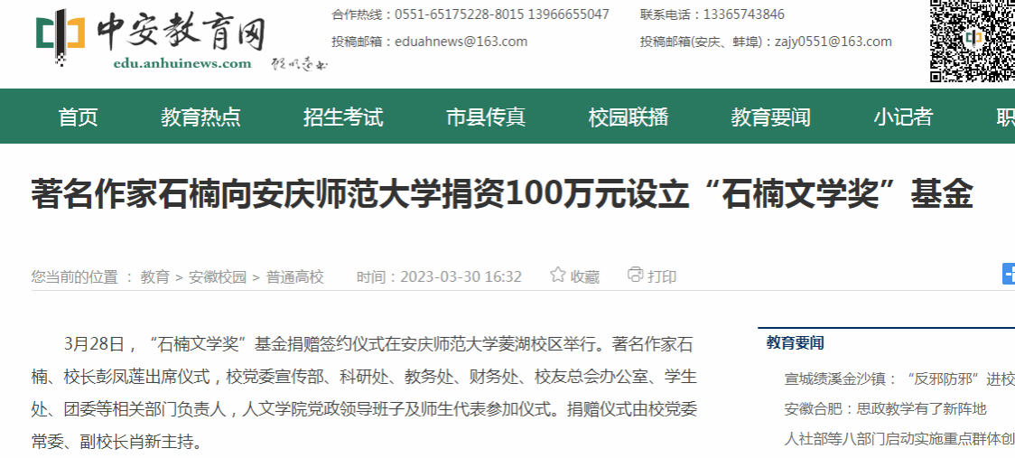 3月28日,“石楠文学奖”基金捐赠签约仪式在beat365平台唯一官网菱湖校区举行。著名作家石楠、校长彭凤莲出席仪式,校党委宣传部、科研处、教务处、财务处、校友总会办公室、学生处、团委等相关部门负责人,人文学院党政领导班子及师生代表参加仪式。捐赠仪式由校党委常委、副校长肖新主持。