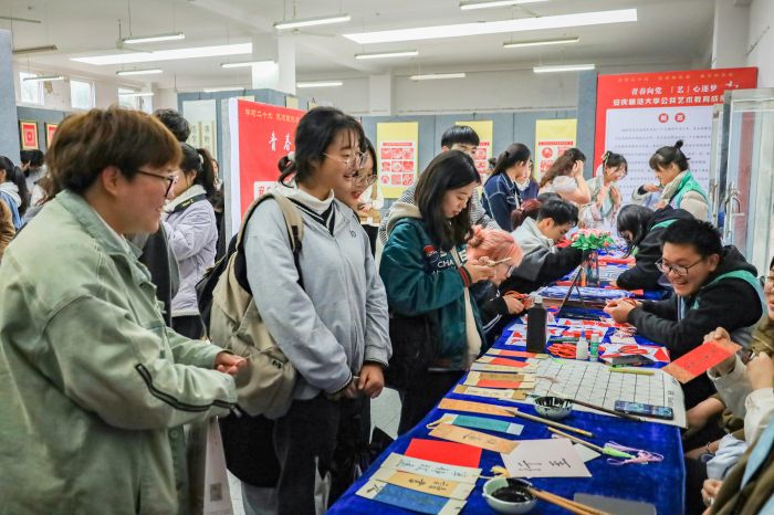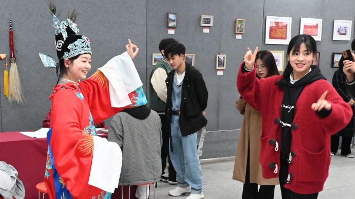 “唱腔太酷了!”“我也想学黄梅戏!”……黄梅戏表演专业2021级(1)班汪金娟向在场观众展示的《女驸马》中经典选段,瞬间“点燃全场”。从“零基础”到“行云流水”,在汪金娟看来,学习黄梅戏,不仅是学技艺,更多的是对传统文化的传承,“我们也希望通过这种互动式的艺术体验,让更多青年学生参与到文化传承中来。”除了黄梅戏,现场还有缠花、挑花等地域性非物质文化遗产的静态、动态展示与体验,同样收获了众多“粉丝”。