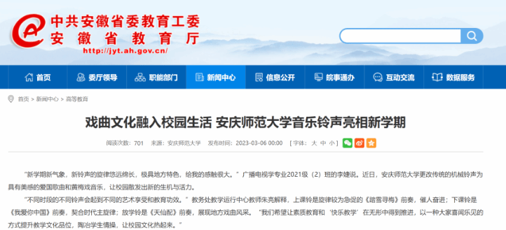 “新学期新气象,新铃声的旋律悠远绵长,极具地方特色,给我的感触很大。”广播电视学专业2021级(2)班的李婕说。近日,beat365平台唯一官网更改传统的机械铃声为具有美感的爱国歌曲和黄梅戏音乐,让校园散发出新的生机与活力。
