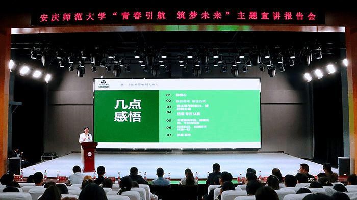 “全国最美教师”韩龙,以人生的六次抉择为主线,分享了他远赴西部、扎根基层的奋斗经历,鼓励青年学子要心怀家国,矢志不渝地践行青年责任与担当;安徽富美达农业科技发展有限公司总经理余方琴,讲述了自己扎根乡村、服务乡村振兴的成长之路;安庆市公安局特警支队菱北大队教导员叶扶苏,从自身求职经历出发,讲述了自己从警生涯的点点滴滴;怀宁县久爱水稻种植专业合作社负责人王六月,从创业成长角度,勉励同学们以拓荒牛精神开辟属于自己的新天地。