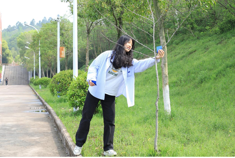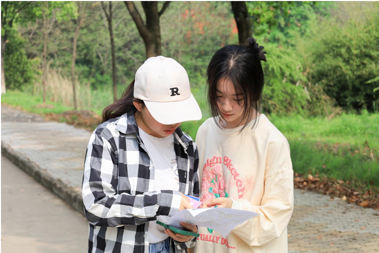 当天清晨,参与活动的45名学生陆续到达起点,9支队伍分批次出发,根据手绘地图寻找分散在校园各角落的“金句”,依次解锁闯关活动。“卡片藏匿的位置太隐蔽,我们一开始无从下手。”国际经济与贸易专业2021(2)班的鹿安惠说。考虑到集体行动效率较慢,她与队友转变策略,分头行动,不久便集齐了10张卡片。