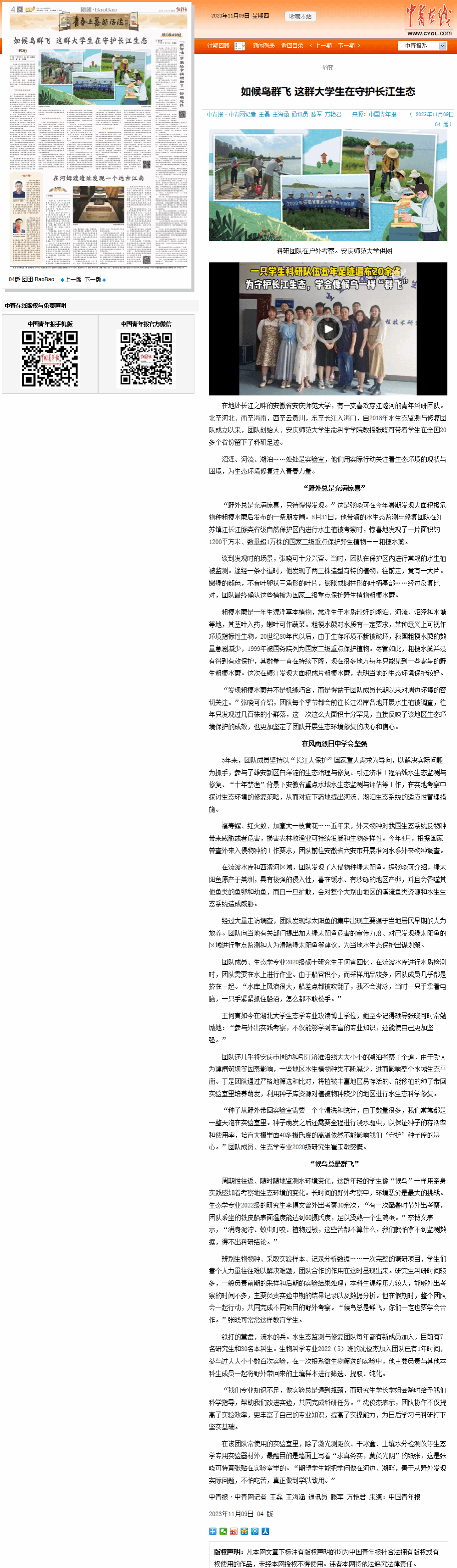 5年来,团队成员坚持以“长江大保护”国家重大需求为导向,以解决实际问题为抓手,参与了雄安新区白洋淀的生态治理与修复、引江济淮工程沿线水生态监测与修复、“十年禁渔”背景下安徽省重点水域水生态监测与评估等工作,在实地考察中探讨生态环境的修复策略,从而对症下药地提出河流、湖泊生态系统的适应性管理措施。