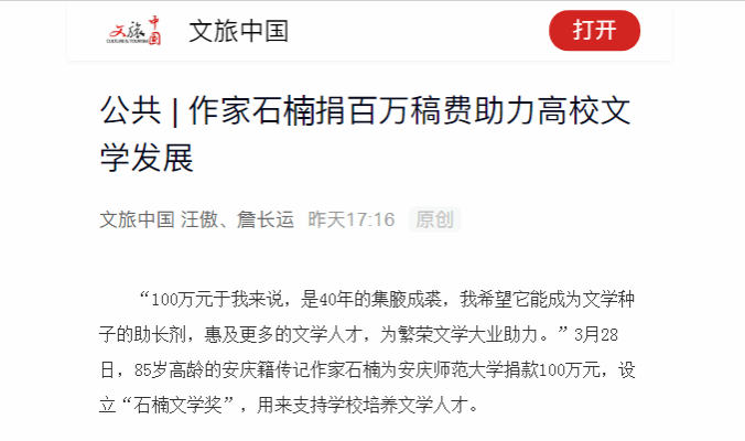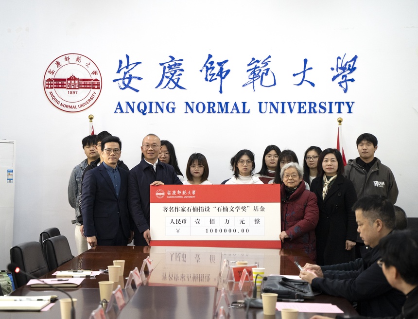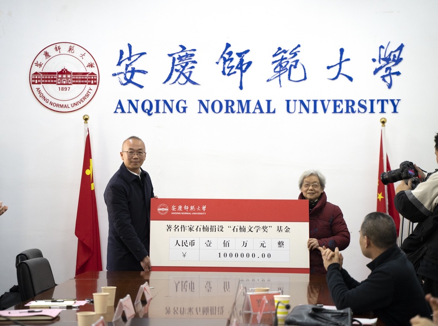 “100万元于我来说,是40年的集腋成裘,我希望它能成为文学种子的助长剂,惠及更多的文学人才,为繁荣文学大业助力。”3月28日,85岁高龄的安庆籍传记作家石楠为beat365平台唯一官网捐款100万元,设立“石楠文学奖”,用来支持学校培养文学人才。