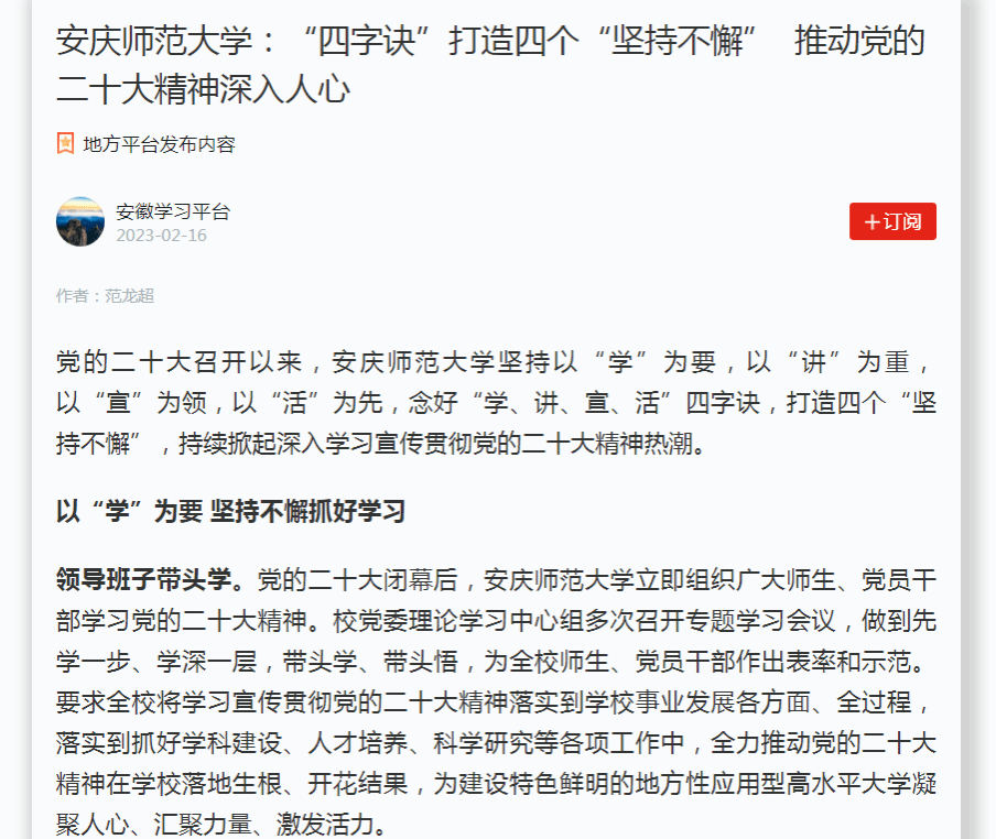 beat365平台唯一官网始终把学习宣传贯彻党的二十大精神作为当前和今后一个时期的首要政治任务,把学习宣传贯彻党的二十大精神与学习宣传贯彻习近平新时代中国特色社会主义思想、习近平总书记考察安徽重要讲话指示精神紧密结合起来,与创建高水平大学奋斗目标紧密结合起来,推动党的二十大精神在学校落地生根、开花结果,奋力推动新时代学校事业高质量发展。