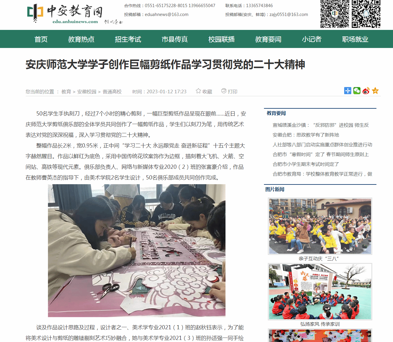 “学生们在创作过程中进一步了解剪纸和剪纸背后的传统文化。”曹英杰表示,学生们通过创作主题剪纸作品,进一步深刻感悟新时代十年的伟大变革在党史、新中国史、改革开放史、社会主义发展史、中华民族发展史上的里程碑意义,是一堂鲜活的艺术思政课。(文/余胜兰;图/江庆阳、张亚龙)