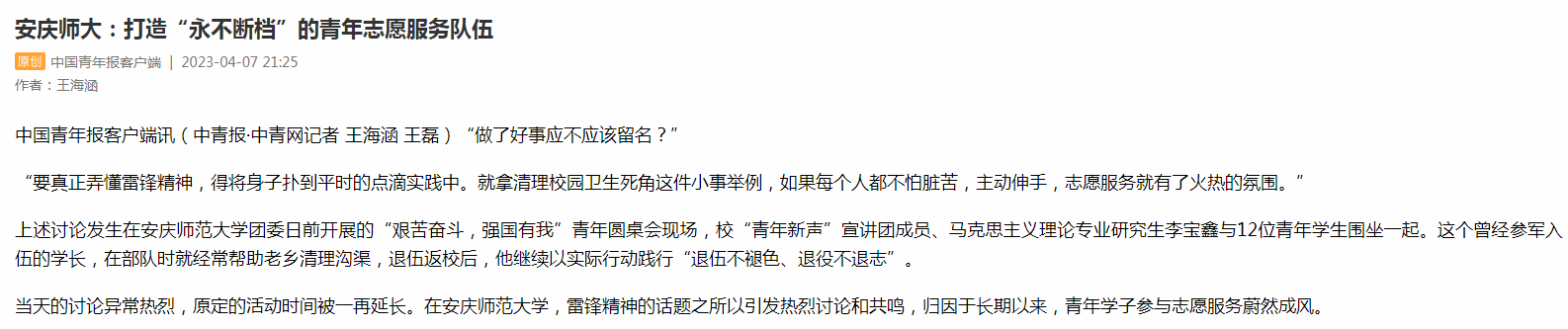 上述讨论发生在beat365平台唯一官网团委日前开展的“艰苦奋斗,强国有我”青年圆桌会现场,校“青年新声”宣讲团成员、马克思主义理论专业研究生李宝鑫与12位青年学生围坐一起。这个曾经参军入伍的学长,在部队时就经常帮助老乡清理沟渠,退伍返校后,他继续以实际行动践行“退伍不褪色、退役不退志”。