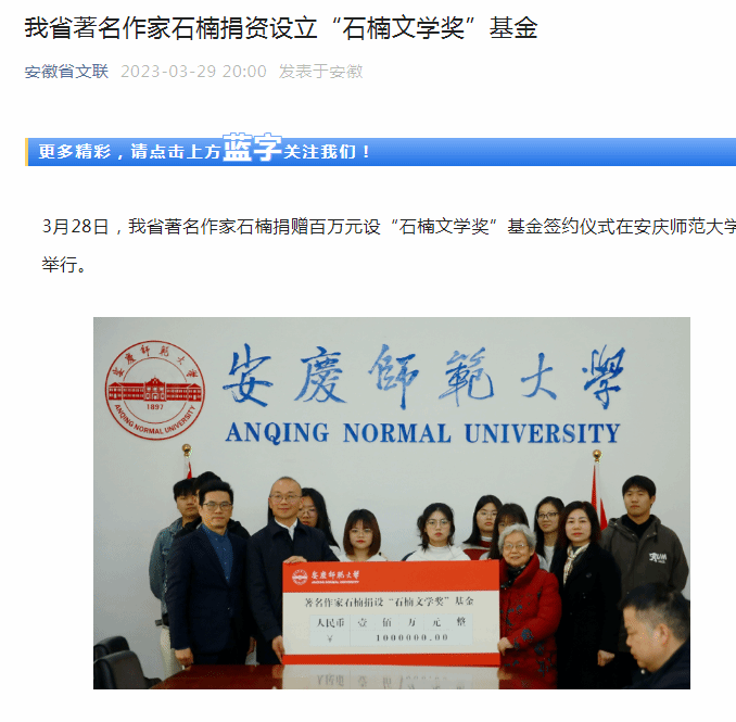 “一百万元于有钱人算不了什么,可于我来说,却是四十年的集腋成裘,它是三块五块,十块百块,我毕生爬格子的辛苦报酬。”石楠希望它能成为文学种子的助长剂,希望基金会和评奖会用好它,壮大它,希望在你们的管理和运作下,努力吸纳社会爱心捐助,使基金逐渐壮大,惠及更多的文学人才,为繁荣文学大业助力。