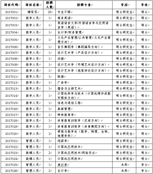 (二)应聘辅导员岗位的,须为全日制统招学术型硕士,第一学历为全日制本科并获得学士学位;应聘教学岗位的,应为全日制统招学术型硕士,第一学历为全日制本科并获得学士学位,其中商务英语(岗位代码2017002)、音乐舞蹈学(岗位代码2017006)、播音与主持艺术(岗位代码2017006)可为全日制统招专业硕士;应聘管理或教辅岗位的,须为全日制统招研究生,第一学历为全日制本科并获得学士学位。