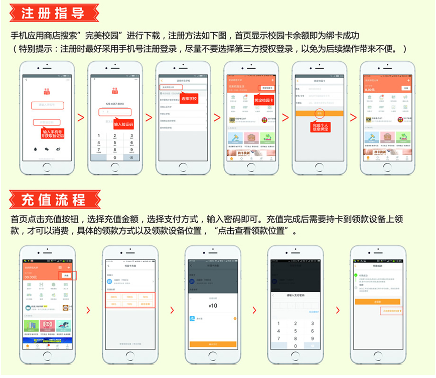 安装完成后,绑定校园卡,用户通过手机终端自助充值后,须到自助领款机或圈存机处写卡领取(各食堂大厅、图书馆和教学楼大厅处),即充值成功。
