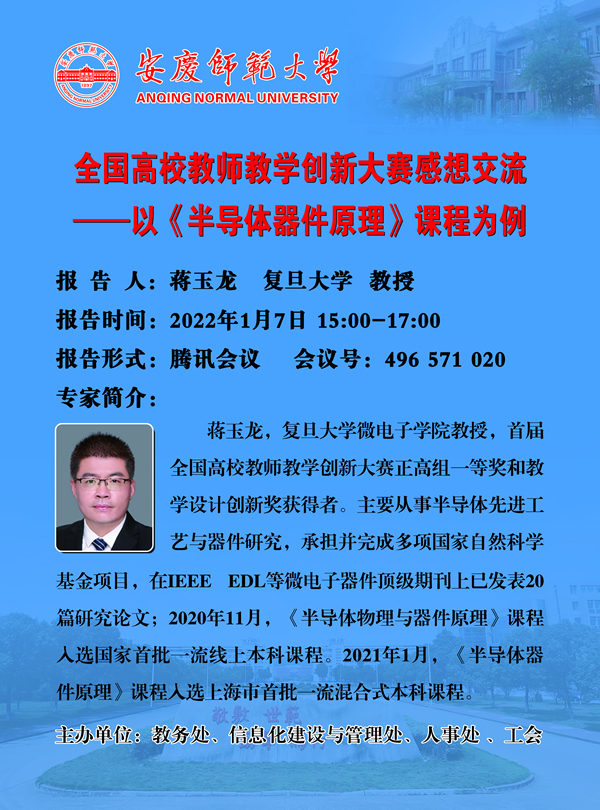 为进一步提高beat365官网教师教学创新意识与能力,营造浓厚教学创新氛围,加强师资队伍建设,学校决定组织教师教学创新能力培训,特邀复旦大学蒋玉龙教授开设“如何提高高校教师教学创新能力”线上讲座,相关事宜通知如下: